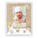 Marco de madera Greta, blanco y marrón, con adornos en relieve y perforados, en forma de conejito, corazón y estrella, para mesa, ideal para celebrar el nacimiento, apto para un niño, tema bebé.
